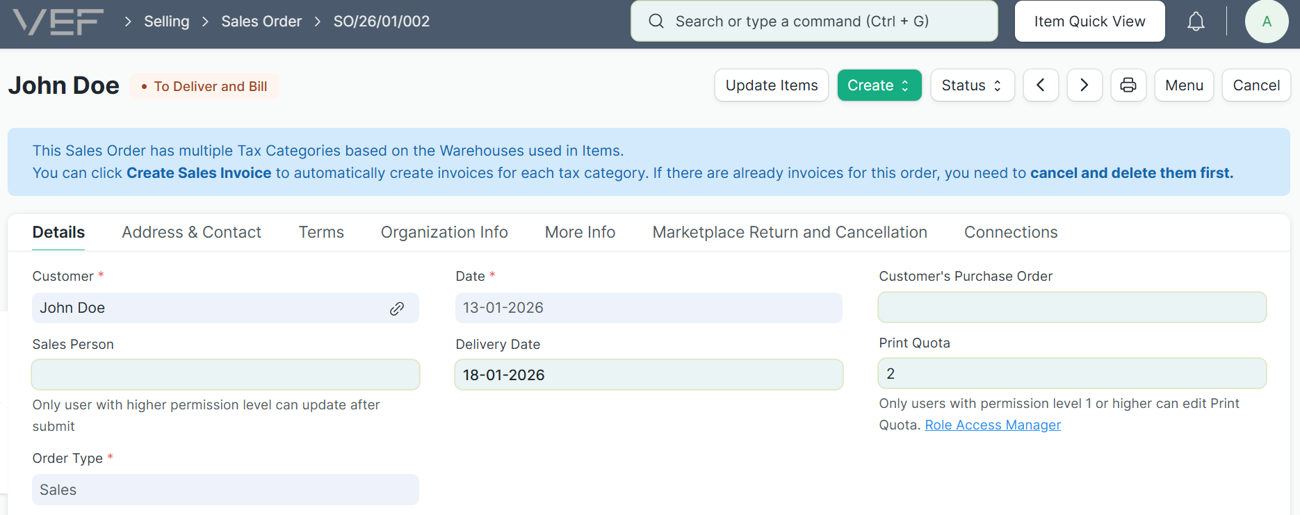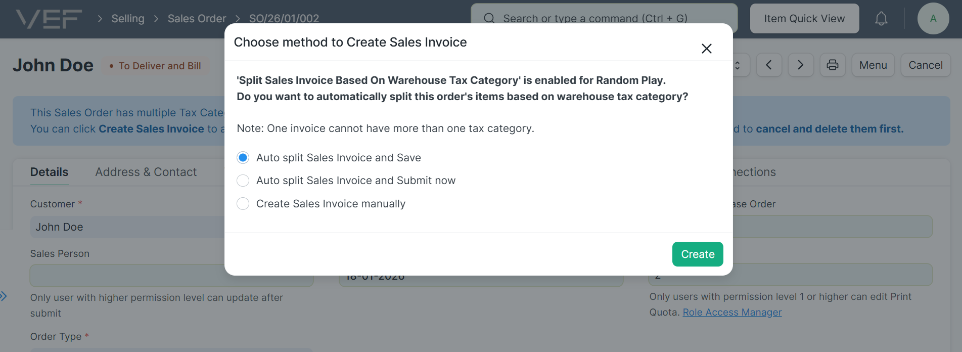 Ketika fitur ini aktif, jika sebuah Sales Order berisi item dari dua atau lebih Warehouse dengan Tax Category berbeda, sistem akan membuat dua atau lebih Sales Invoice yang masing-masing hanya berisi item dari Warehouse dengan Tax Category yang sama.