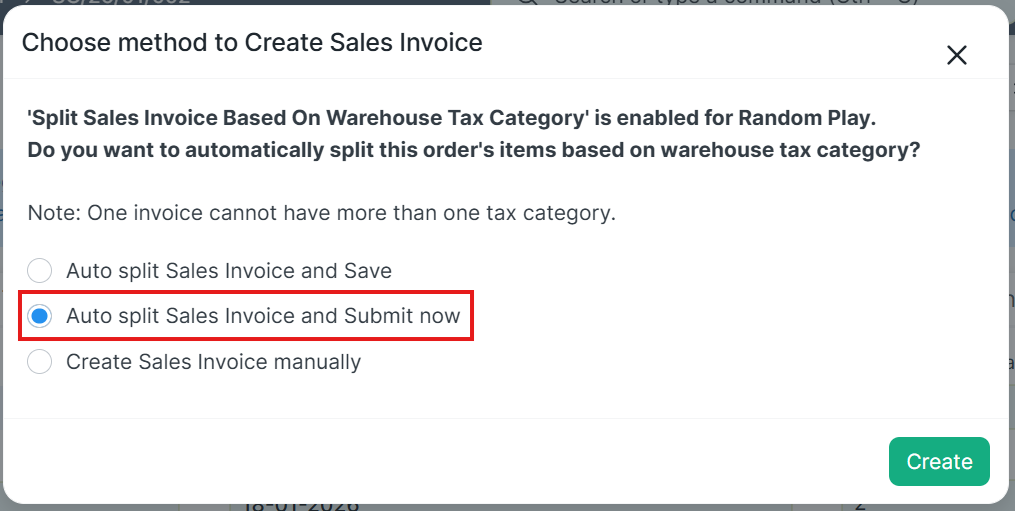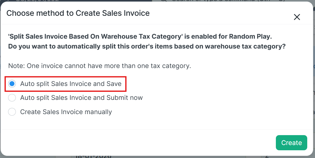 Perhatian! Ketika fitur Auto Split Faktur Penjualan Berdasarkan Tax Category aktif, anda harus menghapus seluruh Sales Invoice terkait Sales Order sebelum menggunakan fitur ini untuk membuat kembali Sales Invoice.