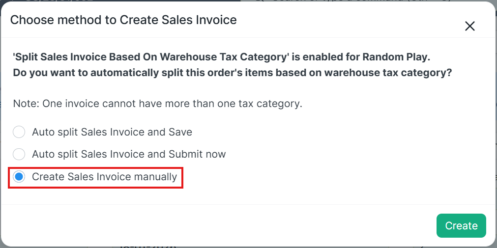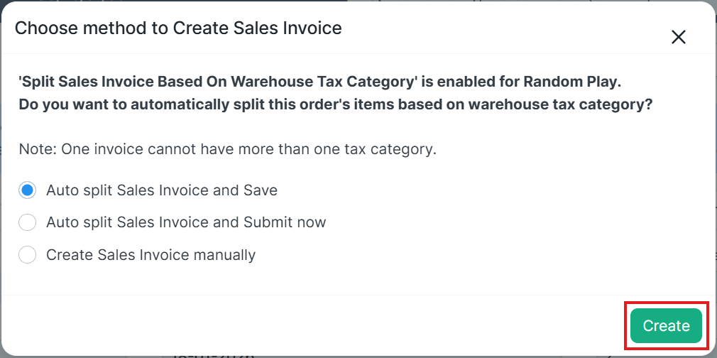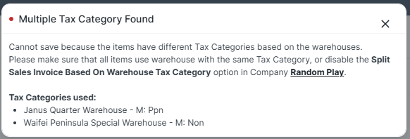 Jika anda membuat Sales invoice secara manual dengan fitur Auto Split Faktur Penjualan Berdasarkan Tax Category diaktifkan, pastikan Sales Invoice yang anda submit tidak memiliki item-item yang berasal dari Warehouse dengan Tax Category yang berbeda.