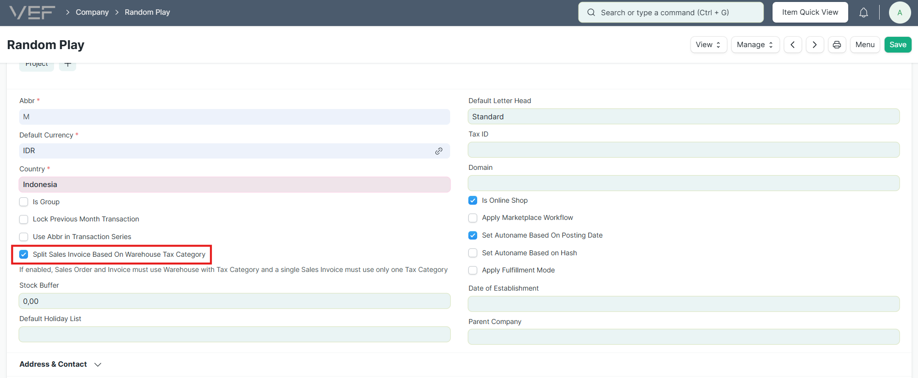 Centang opsi Split Sales Invoice Based On Warehouse Tax Category untuk mengaktifkan fitur.