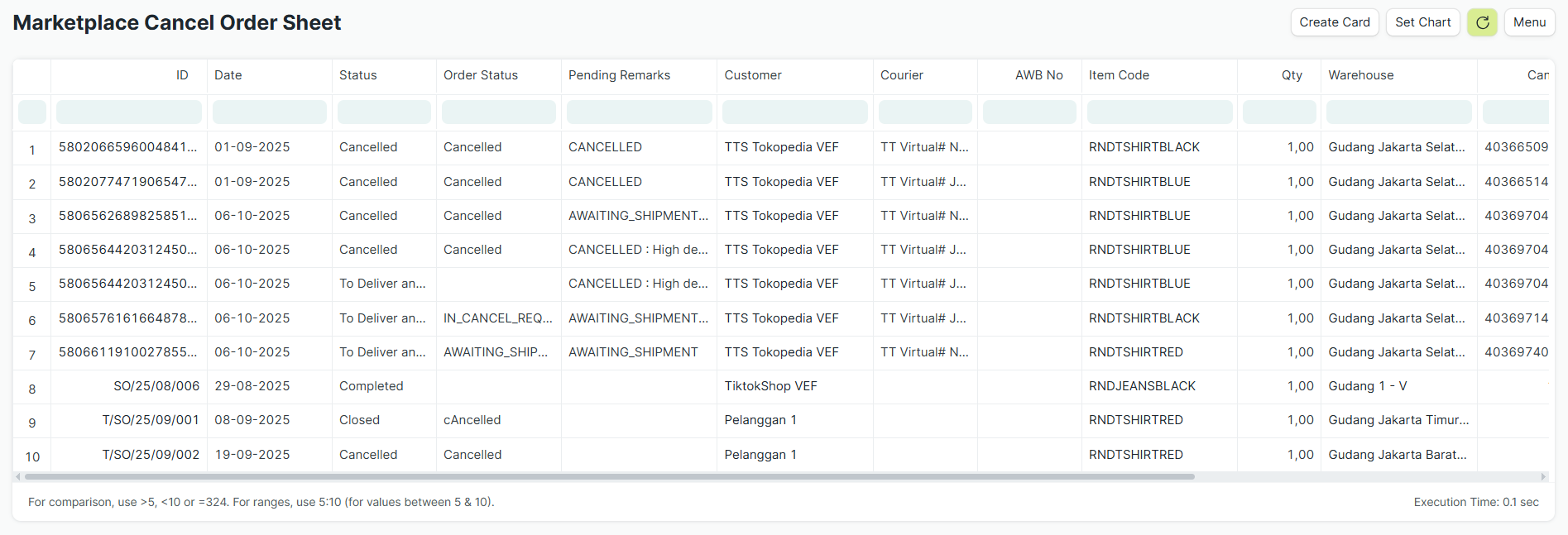 Marketplace Cancel Order Sheet adalah laporan yang digunakan untuk memantau dan melacak semua pesanan yang telah diajukan permintaan pembatalan (cancellation) oleh pelanggan. Data ini mencakup detail pesanan yang tidak jadi diproses atau dibatalkan karena alasan tertentu, seperti kesalahan pembelian, masalah pembayaran, atau permintaan dari pelanggan. Selain itu, laporan ini juga mencatat pesanan yang pernah diajukan permintaan pembatalan, namun pembatalannya ditolak dan pesanan tetap dilanjutkan (misalnya, setelah verifikasi ulang atau keputusan dari tim terkait).
