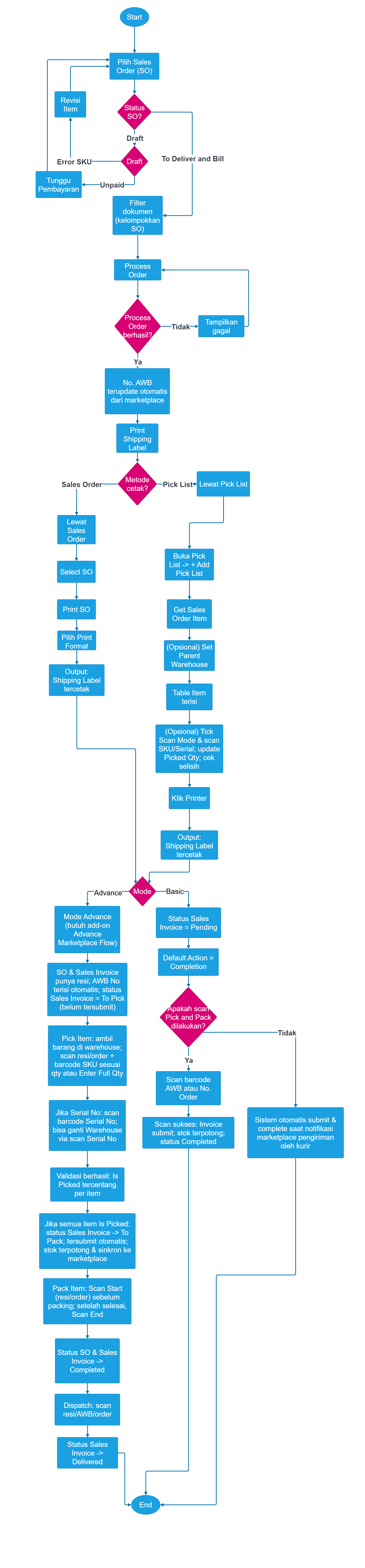 Setiap ada pesanan yang masuk dan sudah dibayar oleh customer, pesanan tersebut akan masuk ke Sales Order. Jika tidak terjadi Error SKU, Sales Order secara otomatis akan tersubmit dan Sales Invoice akan terbuat dengan status Pending. Jika ada perubahan di Marketplace, Sales Order dan Sales Invoice akan mengikuti.