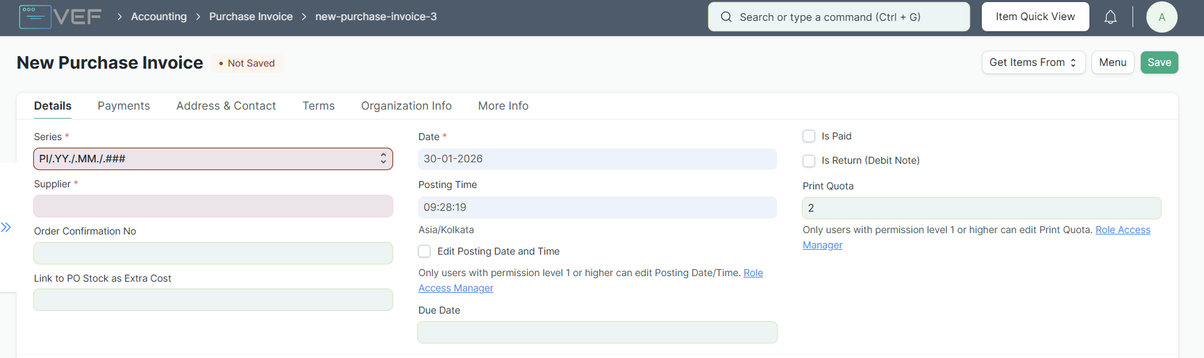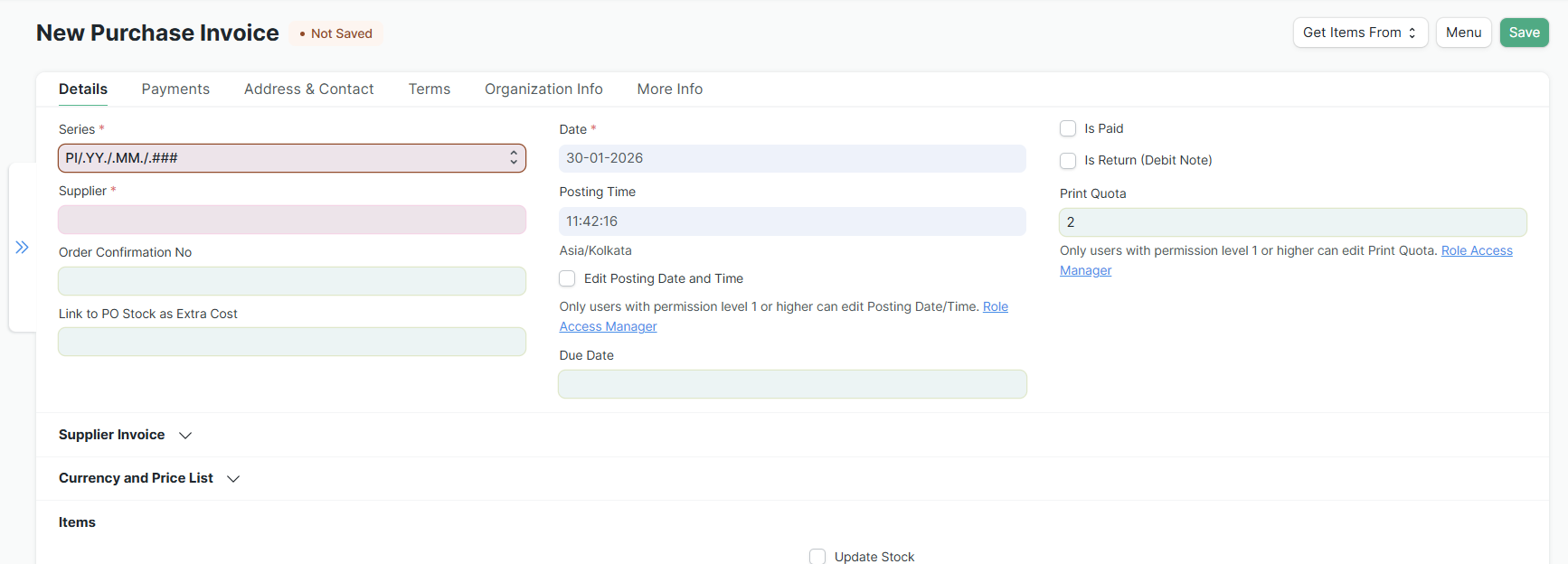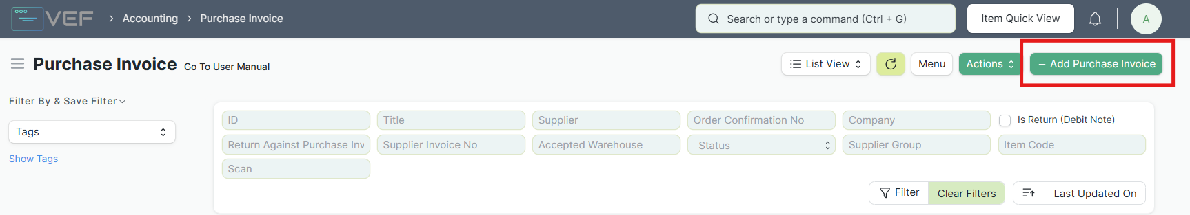 Masuk ke modul Accounting, pilih Purchase Invoice, lalu klik + Add Purchase Invoice.