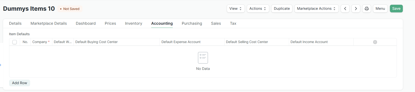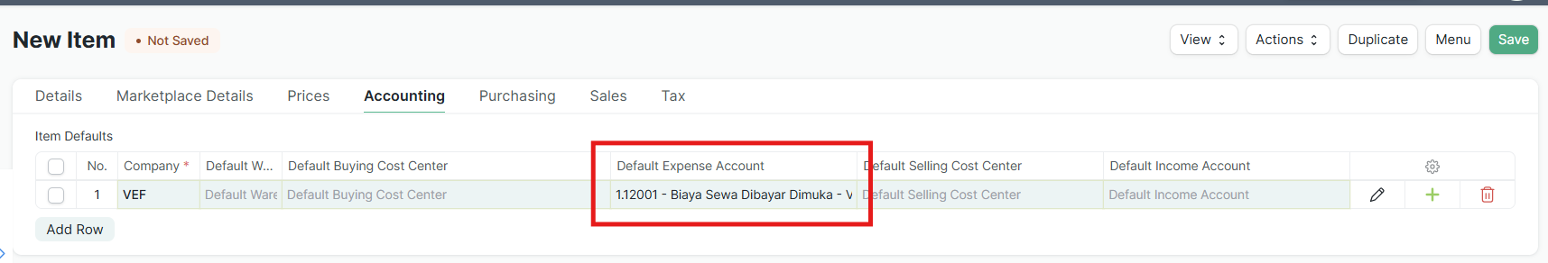 Pindah ke tab Accounting. Pada tabel "Item Defaults", klik Add Row.