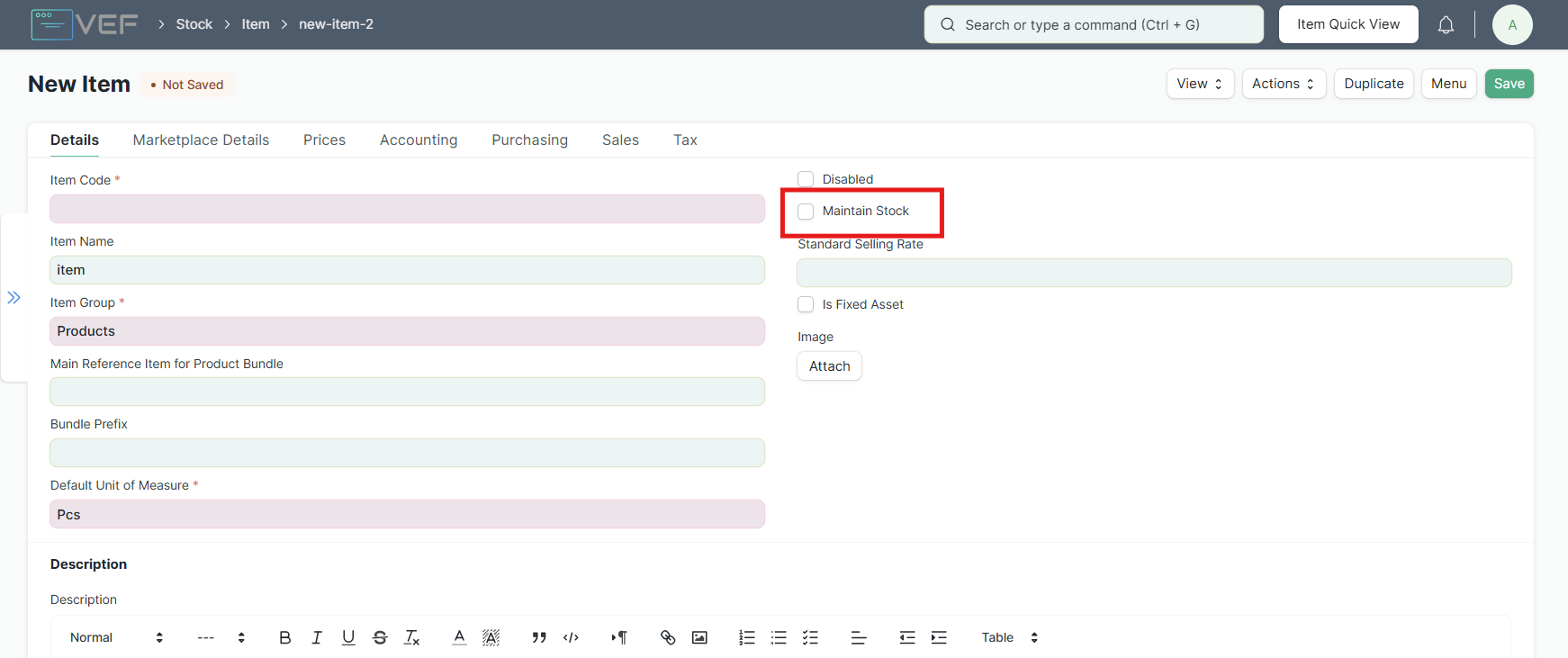 Penting: Hapus centang (uncheck) pada opsi Maintain Stock. Ini menandakan bahwa item ini adalah jasa atau biaya, bukan barang fisik yang disimpan di gudang.
