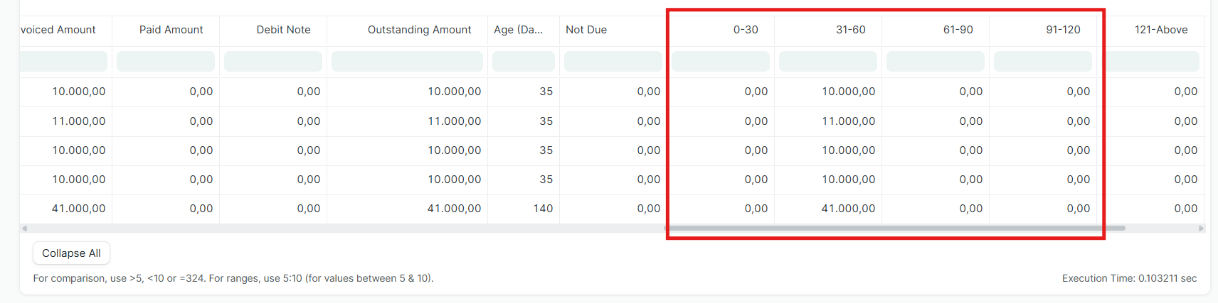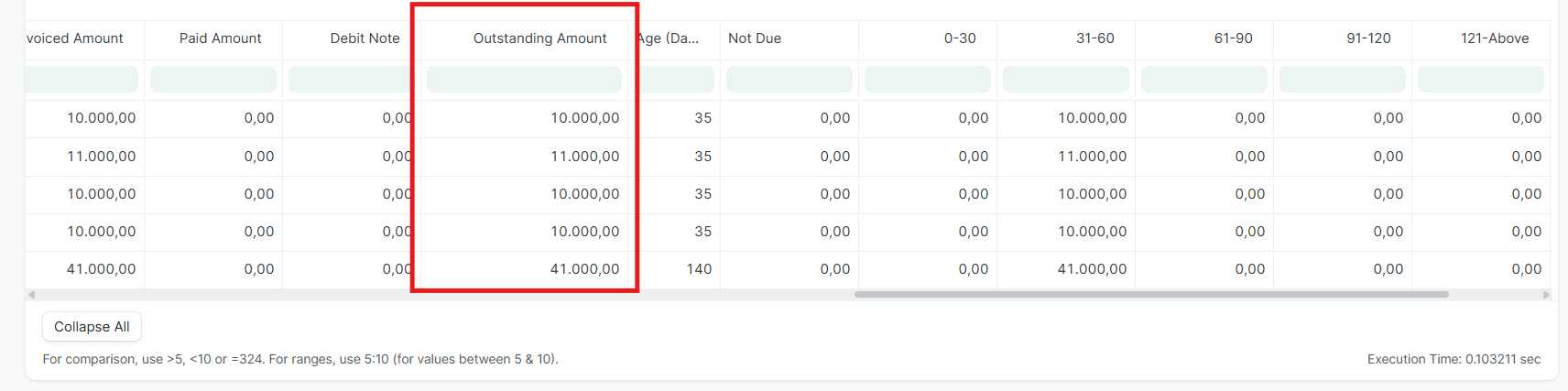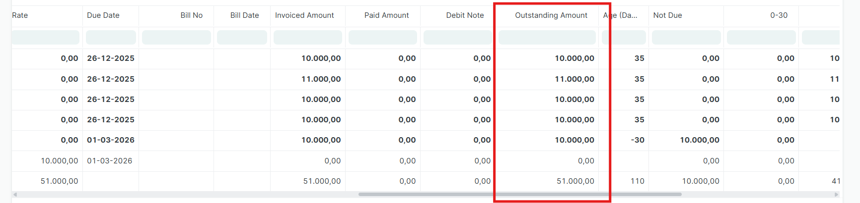 Lihat tabel laporan di bawah filter. Gulir ke kanan untuk melihat kolom Outstanding Amount guna mengetahui nominal yang belum dicairkan/dibayar.
