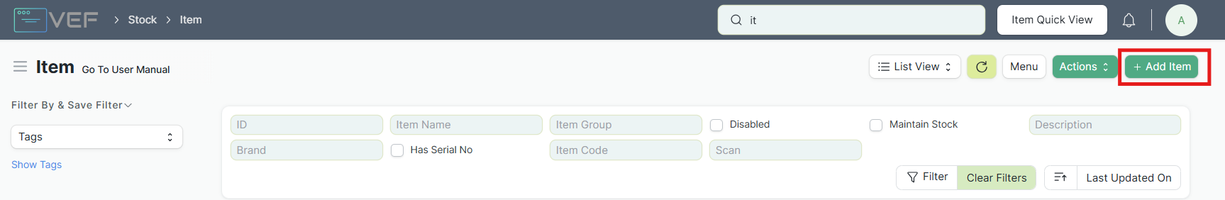 Masuk ke modul Stock, pilih menu Item, lalu klik tombol + Add Item.