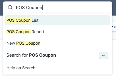 Search Bar (Kolom Pencarian): Ketik POS Coupon pada kolom pencarian, lalu pilih POS Coupon List.