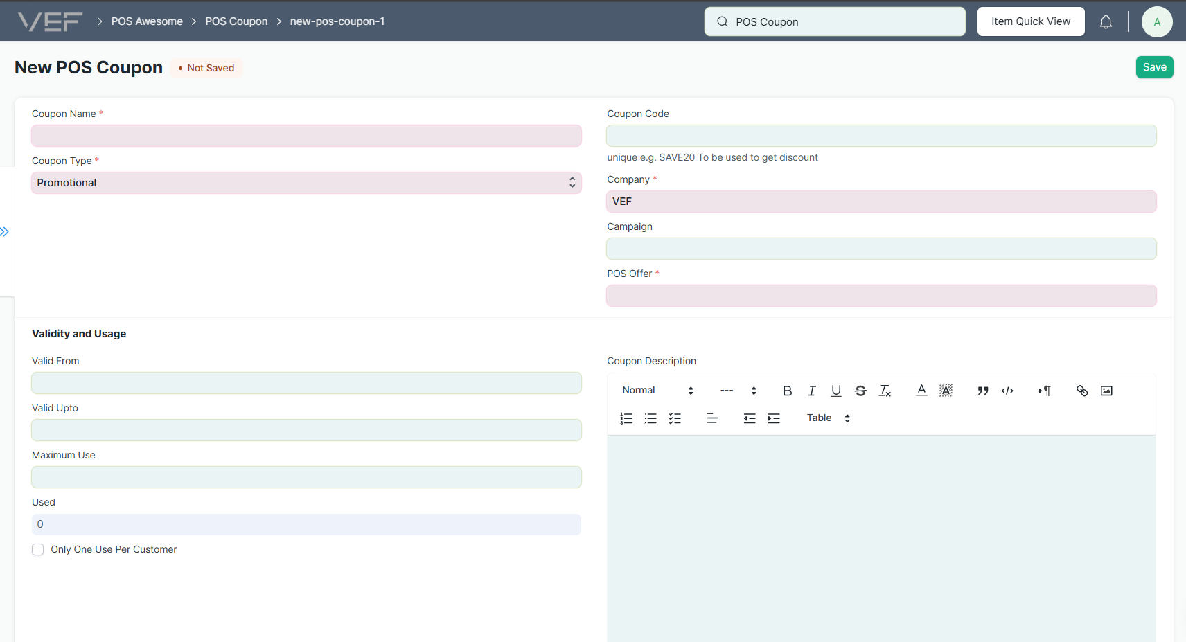 Menu Home: Home > VEF POS > Offers & Coupons > Coupons.