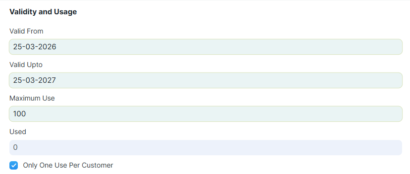Only One Use Per Customer: Jika diaktifkan, setiap customer hanya dapat menggunakan coupon satu kali.