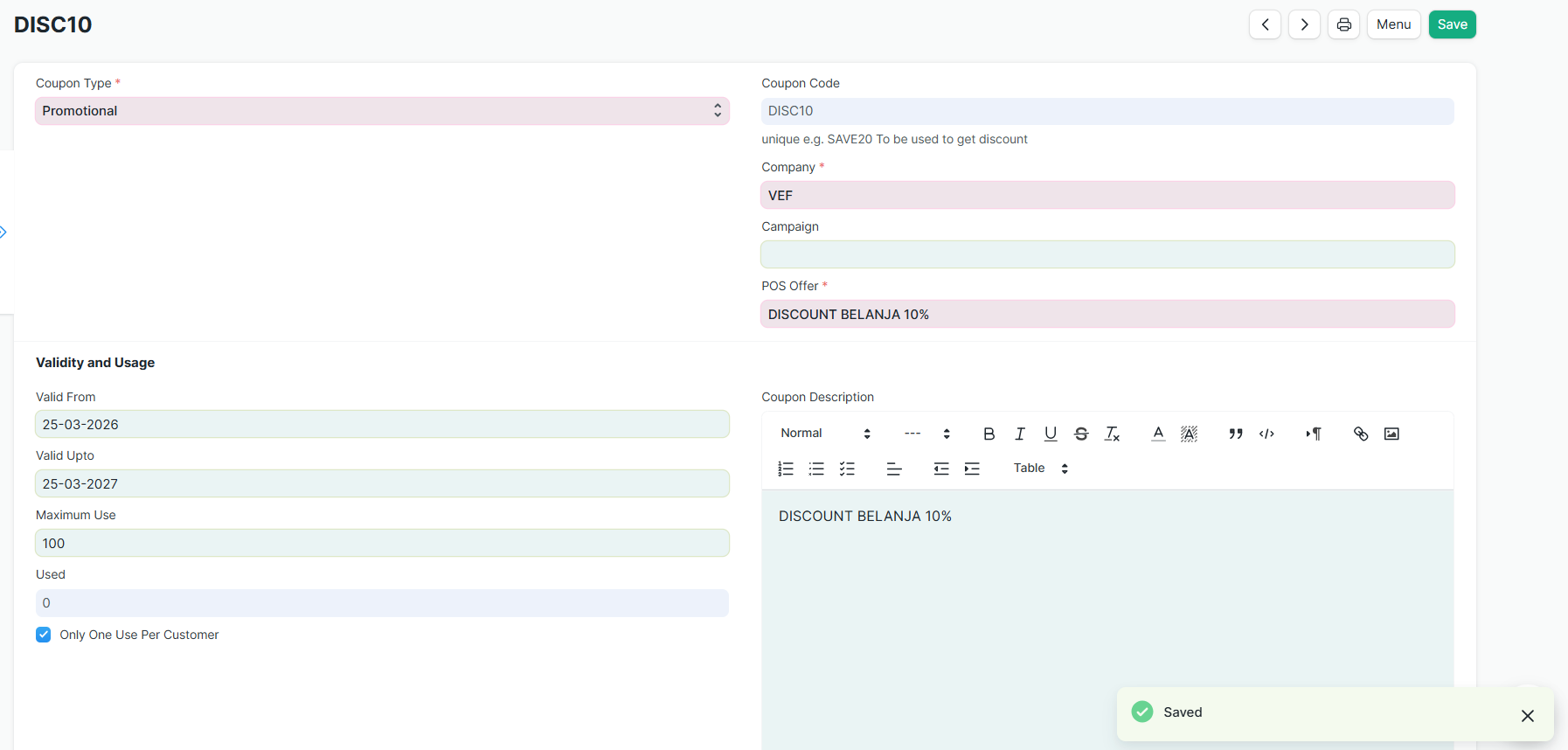 Kemudian jika sudah sesuai lalu tekan Save, dan Coupon Code siap untuk digunakan.